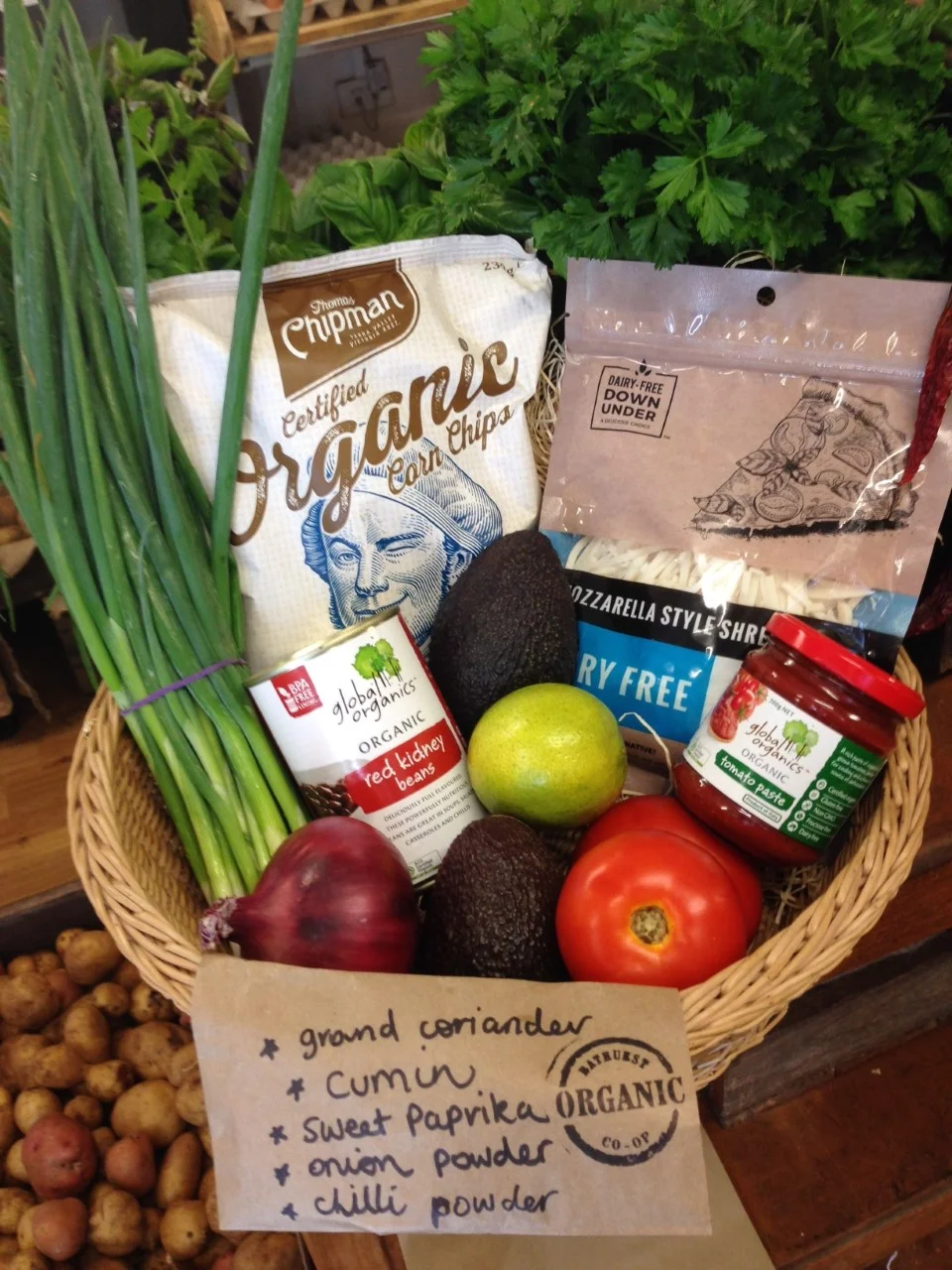 Crunchy organic corn chips, nutritious organic kidney beans sautéed with tomato and flavoursome spices with vegan mozzarella and a creamy organic avocado guacamole with zesty fresh lime – Suitable for vegans, this is a delicious, easy to prepare meal everyone will enjoy. PROVECHO!